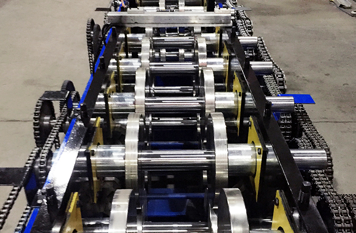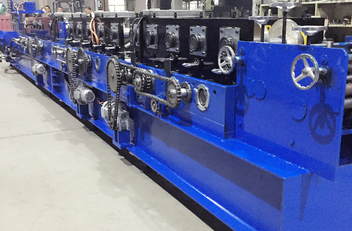 3、成型主机:机架用450H钢焊接而成,机组长度为11米,宽度为1.4米,高度为1.2米,整机重量为18吨,采用电动调节规格方式,换模时间2分钟。轧制规格为宽度100-300mm,高度为40-90mm,压制板材质Q235,厚度为2.0-3.0mm,成型速度为35米/分,主机十六道滚压成型,轮子材料为Cr12MoVi优质合金钢,淬火硬度为HRC60-62,辊轴材料为Ф70圆45#优质碳素钢,经调质处理,硬度为HRC28~32。